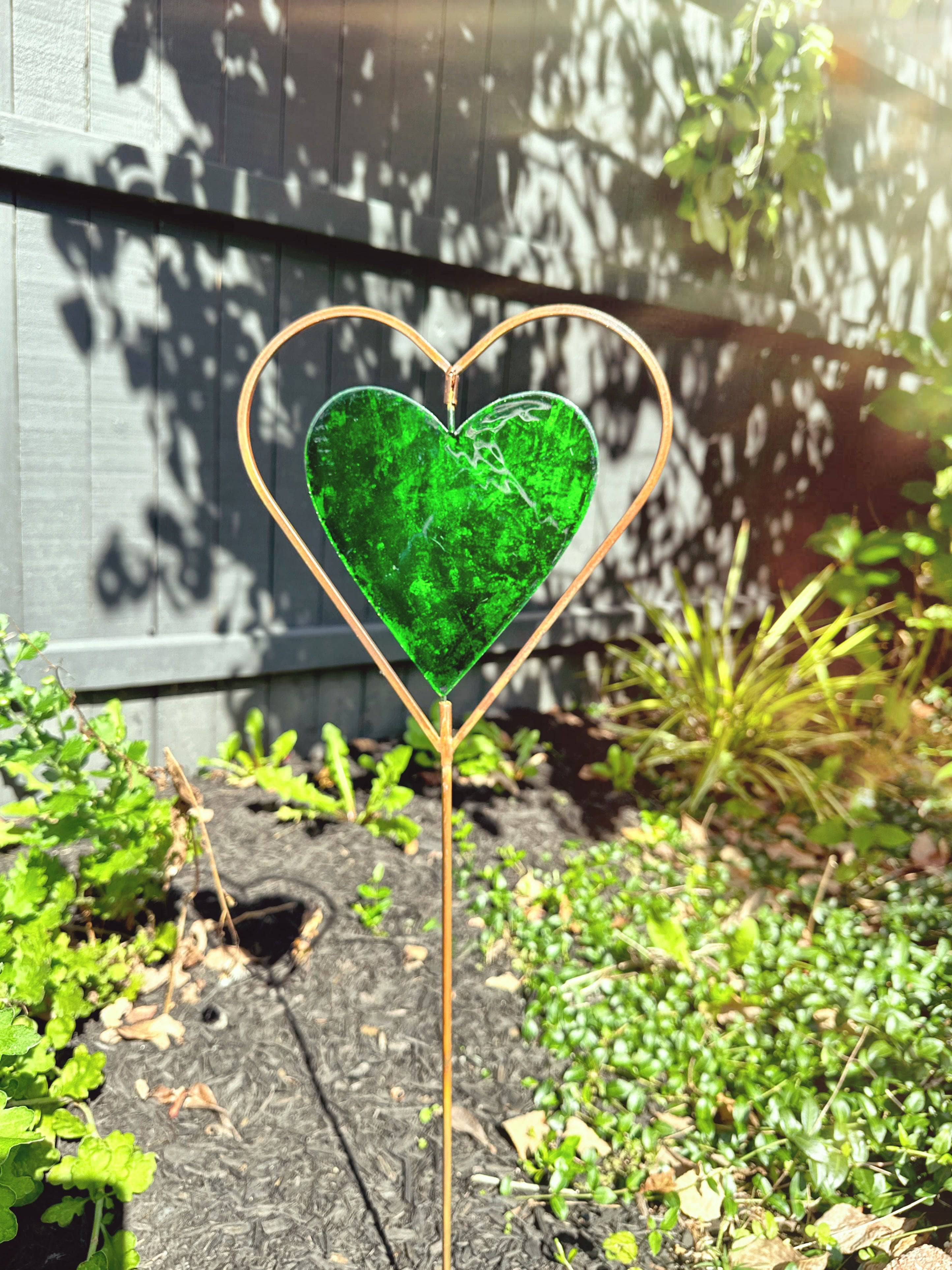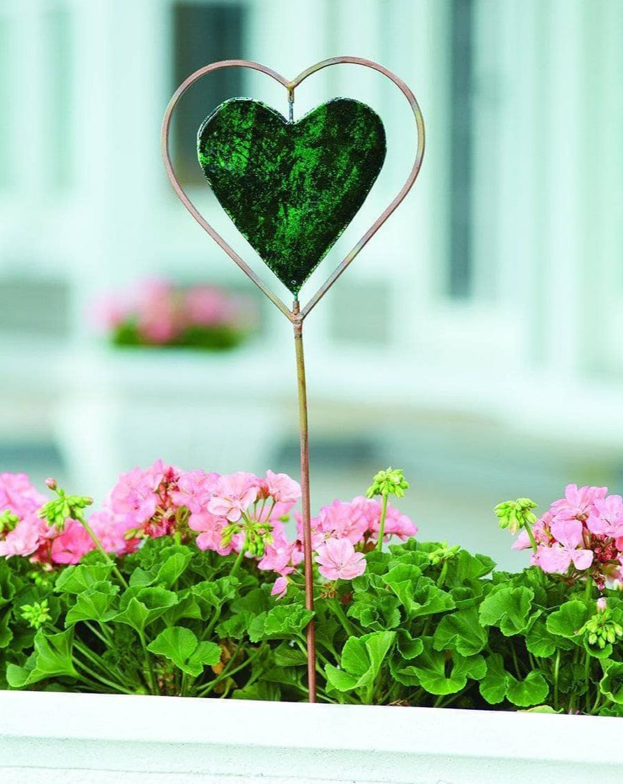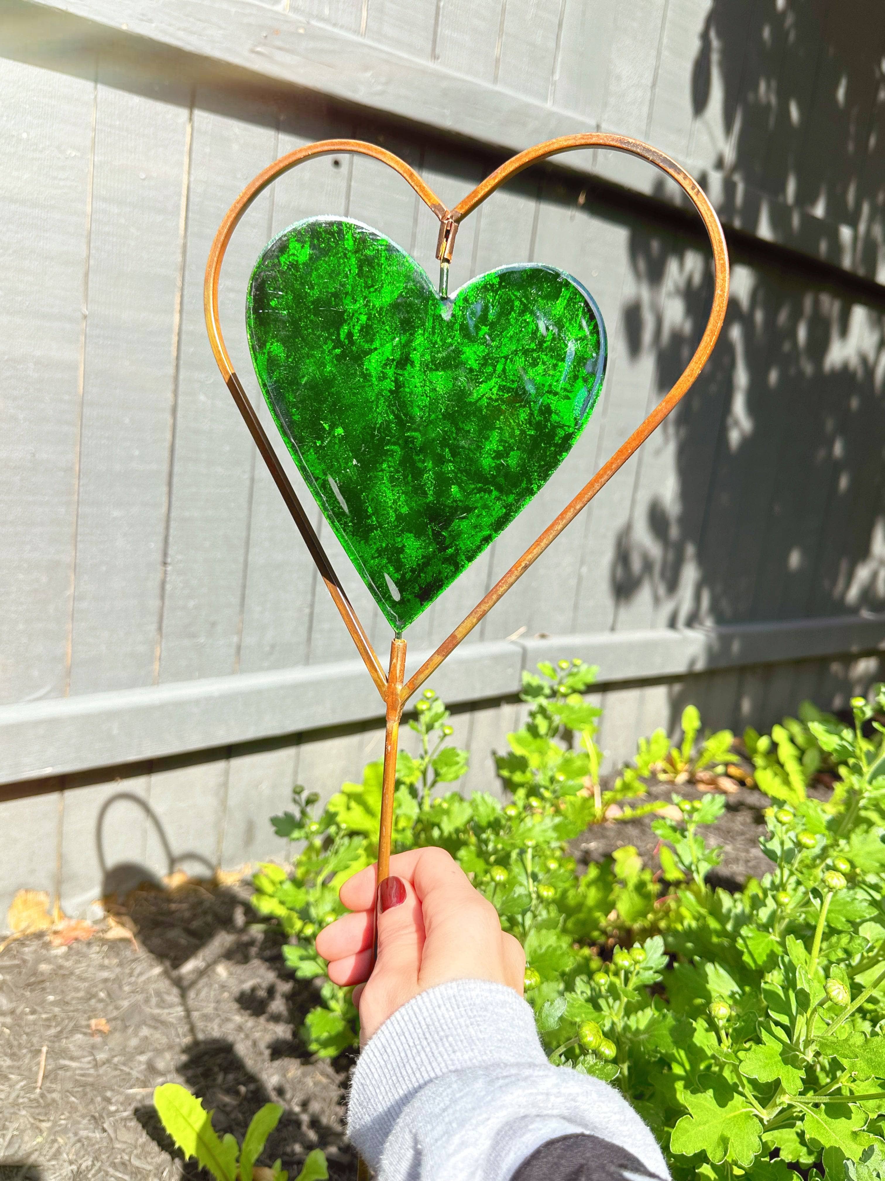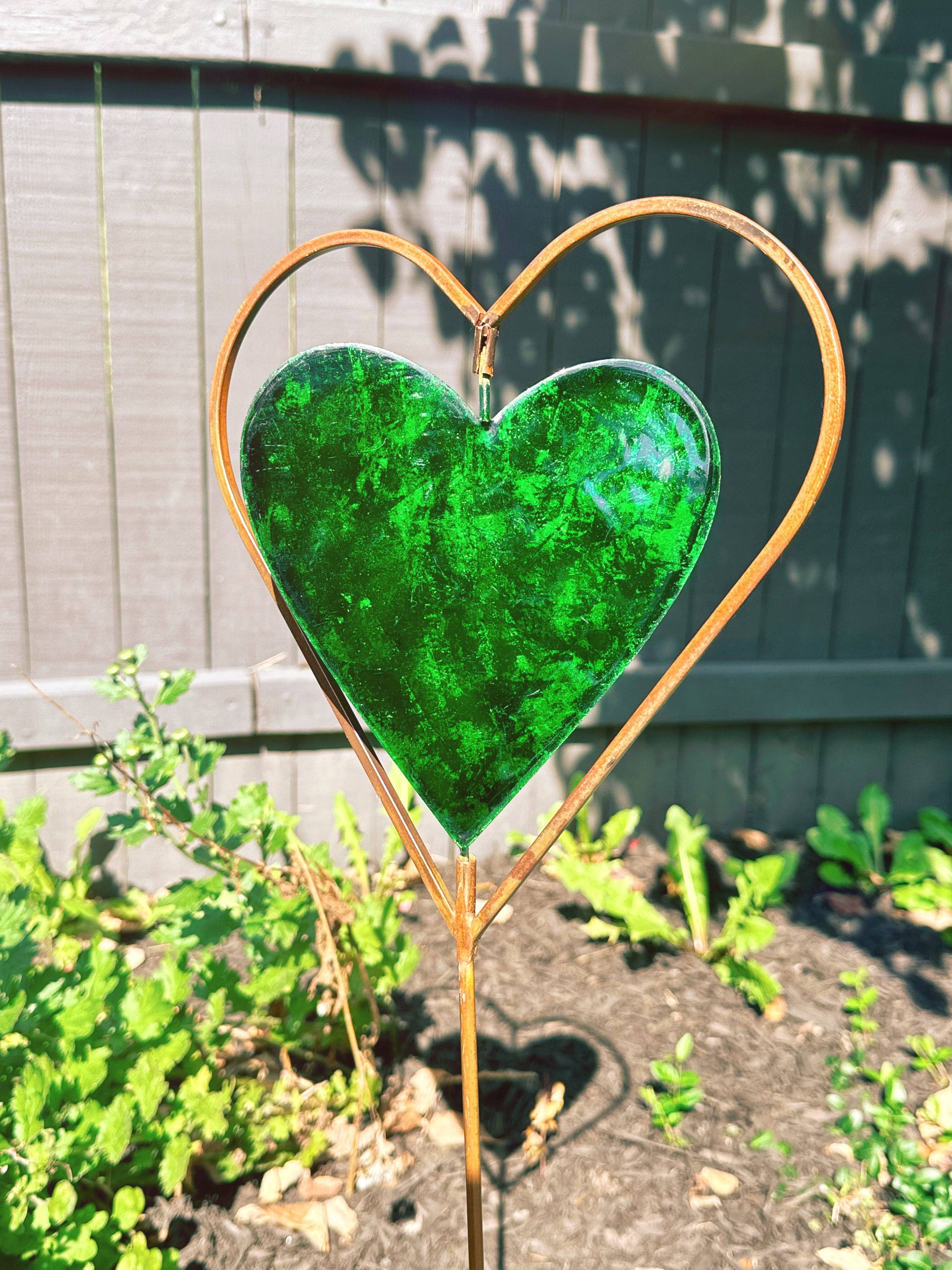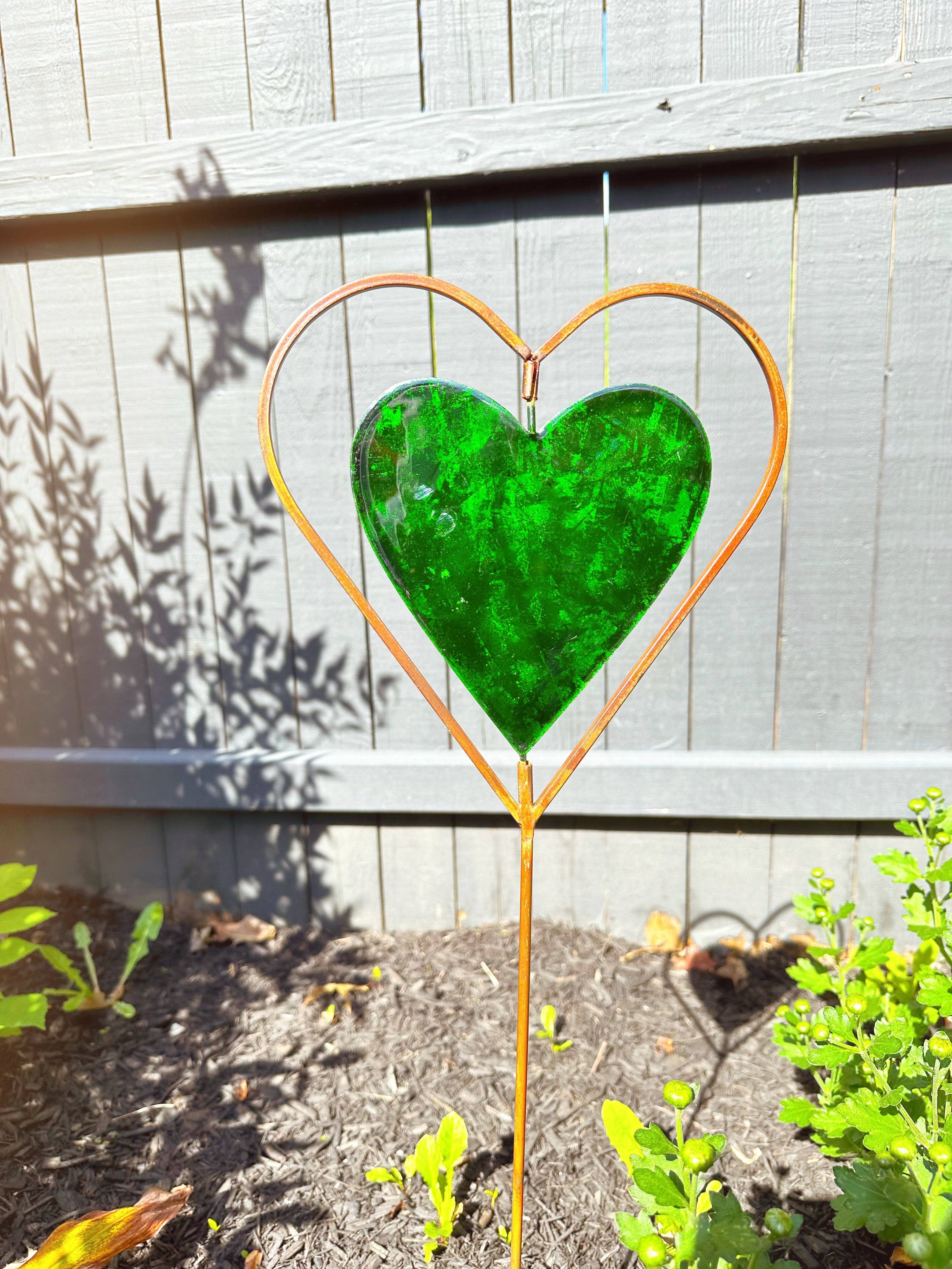 Celebrate your love of the outdoors with our Green Heart Disc Garden Stake! A whimsically enviable piece that blends beautifully with the landscape, it features a colorful central heart surrounded by a frame of contrasting flamed metal. Lovely on its own and even better as part of a larger display, this heart-shaped garden disc makes a fun garden-inspired gift or elevates your own plantings to new heights. Like all Happy Gardens stakes, this one is handcrafted, and brings lasting beauty to your lawn or garden.