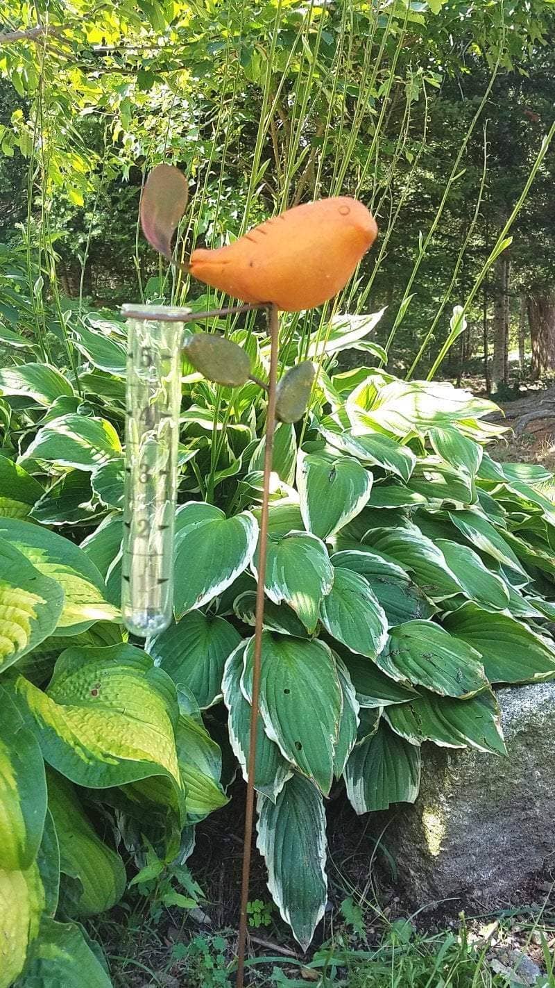 Serious gardeners know that measuring rainfall matters. So, why not measure in style? With our Spice Bird Rain Gauge, you’ll bring a pop of color and a punch of charm to your outdoor space. A strong metal stake also serves as a sturdy twig, holding up a cute little chick and a few handcrafted leaves. The rain gauge itself will report up to five inches of rainfall. Like all Happy Gardens rain gauges, this item was made with the finest of materials and was handcrafted to last.
