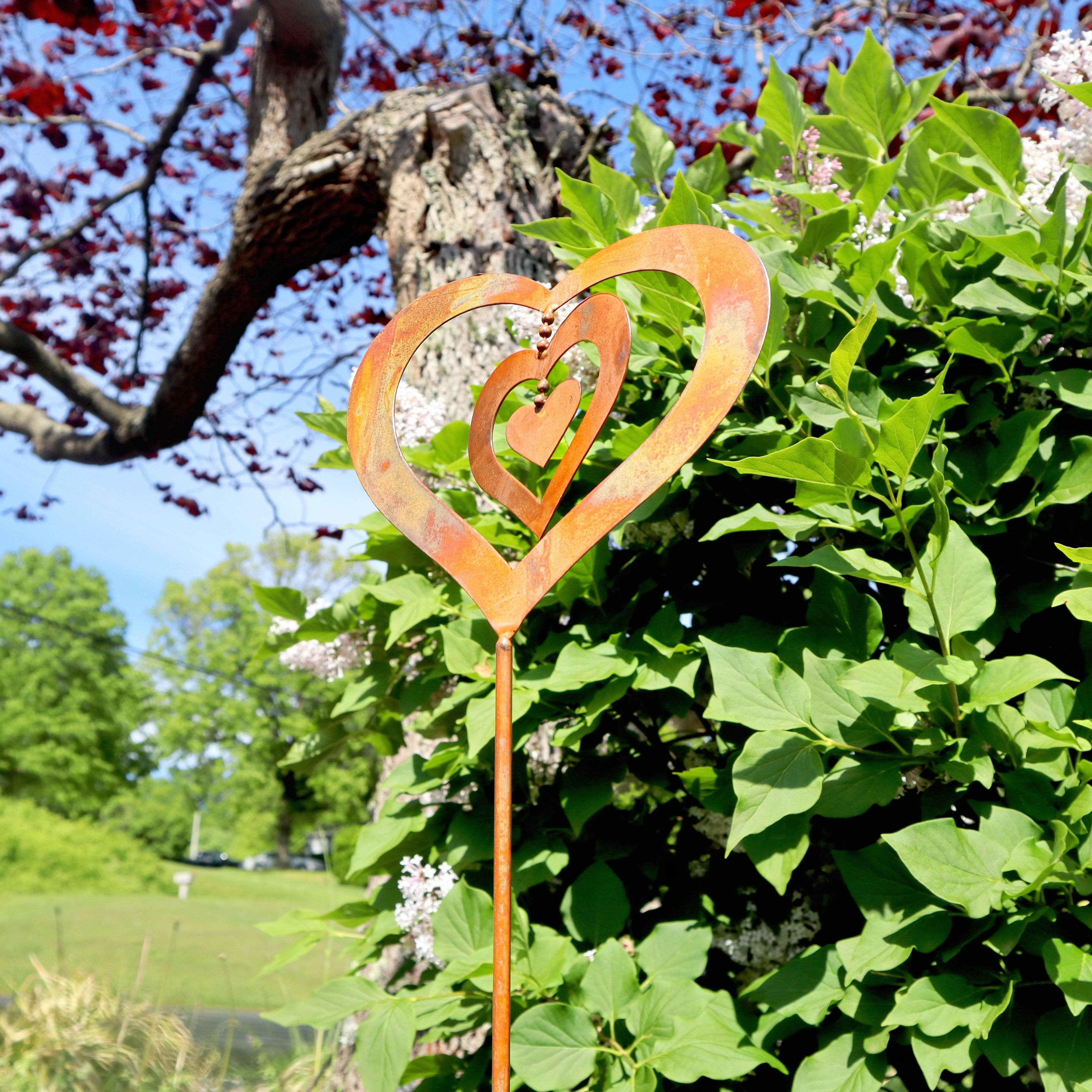 Add a touch of romance to your garden with this best-selling Triple Spinning Heart Garden Stake. This piece has a neutral, iridescent glow that really stands out in green, grassy or leafy areas. This stake spins in the breeze, too, making it even more interesting to onlookers. As always, this item in individually handcrafted and made with care.